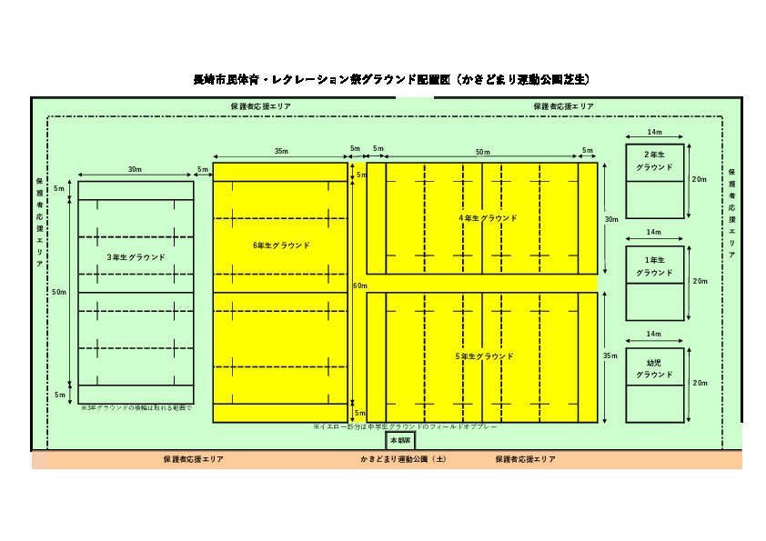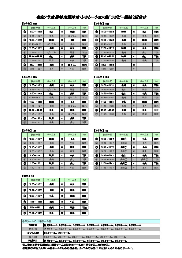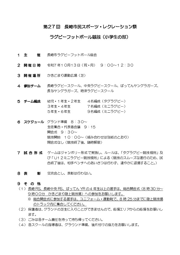 長崎RS、長崎中央RS、ばってんYR の4 年生以上の選手は、総合開会式(8 時30 分~9 時00分 かきどまり陸上競技場)への参加をお願いします。 ※ 総合開会式に参加する選手は、ユニフォーム・運動靴で、8 時25 分までに陸上競技場のトラック内に集合してください。